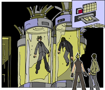 カプセルの中には…。 クラウドに良く似た青年と…。 シュリに瓜二つな青年が…。 穏やかな顔で眠っているようにカプセルの中でユラユラと揺れていた。 「これが……理由か……」 ラミアが言っていた言葉の意味を漸く半分理解した。 『ジェノバ戦役の英雄だから惹かれたのではない』 彼女が自分に惹かれたのは、この目の前で穏やかに眠る彼女の婚約者の面影をクラウドと重ねていた為だろう。 しかし…。 『私は、この世界を愛している。一刻でも早く、安定して、皆が平和に暮らせるようになって欲しい…そう願っている。その為に、クラウドの力が必要なのだ』 この言葉の意味が分からない。 黙って目の前の自分と似た青年を見つめているシュリに、クラウドがこの疑問を質問しようとしたその時、二人は急に『何か』の気配を感じ取り、瞬時に左右へ飛びのいた。 間一髪で、それまで自分達がいた所を、弾丸が飛んでいく。 二人に当たるはずだった弾丸は、その本来の目標物に当たらなかった為そのまま空を突っ切り、カプセルに被弾した。 カプセルに幾つもの弾丸が打ち込まれ、ひびが入る。 ひびからカプセル内の液体が勢い良く放出され、その為にひび自体がカプセル全体に広がるのに時間はかからなかった。 「し、しまった!!何てことだ!!」 「じょ、冗談じゃないぞ、こんな事がバレたら…!!」 「い、今すぐ別のカプセルを用意しろ、早くお二人をそちらに移せば…」 入り口で青い顔をしている二人の科学者が、銃を両手で握り締め、目の前の惨状にパニックになっている。 クラウドとシュリは、瞬時に科学者の目の前へ飛び出すと、その手に持っていた銃を奪い取り、腕を捻り上げて床に押し倒した。 元々、一般人以下の力しかない二人は、たやすく二人に押さえ込まれ、聞き苦しい苦痛の呻き声を上げる。 しかし、それでも目の前でビシビシと音を立てて今にも壊れそうになっているカプセルに、二人は、 「ああ…なんて事だ!!頼む、あの方々をお助けせねば!!」 「この事がディモン様とラミア様にバレたら……我らは終わりだ!!」 半狂乱になって、カプセルの中の二人を助けるよう懇願した。 クラウドは、科学者を押さえつけながら困惑していた。 自分に似た青年が完全に『死』を迎えようとしている。 カプセルの中の液体は、既に半分以上なくなっており、青年の身体もカプセルの底の方で倒れこむ形になっていた。 何より、カプセル自体からは何やら煙らしきものが上がっている。 このまま何もしなければ、本当に……。 クラウドは思わず隣で同じ様に科学者を押さえ込み、何やらその科学者の懐をあさっているシュリを見た。 シュリは、自分に似た青年が『死』を迎えようとしている事に対して、全く無関心のようだった。 彼がカプセルに対して無関心を決め込んでいるのではなく、本当に興味が無いのだとクラウドには分かった。 バリン! クラウドがシュリへと視線を移した直後、何かが割れる音と科学者達が悲鳴を上げる声が同時に耳を打つ。 カプセルが、とうとう大破したのだ。 中にいた青年達は、カプセルの外に投げ出されることなく、カプセルの底に蹲るようにして倒れていた。 クラウドは迷った。 このまま、何も見なかった事にしてこの場を去るか…。 それとも、せめて『遺体』だけでもラミアとシアスに届けるべきか…。 「行くぞ。じきにこいつらのお仲間がやって来る」 迷っているクラウドに、シュリは淡々とそう言うなり、さっさとその場から立ち去ろうと踵を返した。 「ちょ、ちょっと待て!」 クラウドがシュリを引き止めたのは、無意識だった。 怪訝な顔をして振り向く青年に、クラウドは次の言葉が見つからない。 クラウドの心の迷いを感じ取ったのだろう。 シュリはつかつかとクラウドに近付くと、クラウドの手首を取り、強引に引っ張って歩き出した。 二人の背後で、科学者達が悲痛な声を上げながら、カプセルの底に横たわっている青年達を助けようとしている物音がする。 「あの二人は既に死んでる。それも随分昔にだ。だから、ああなってむしろ良かったんだ」 「…………」 「アンタが言いたい事は分かるつもりだ。せめて身体だけでもラミアとシアスに返してやりたい…そう思ったんだろ?」 「…………」 「でも、俺達にはそんな余裕は無いんだ。急いで最後の締めをしないといけないからな」 「…『最後の締め』?」 漸く口を利いたクラウドをシュリは離し、歩調を緩めずチラリとクラウドを見やった。 「ああ。この施設を潰す。二度とこんなばかげた事が出来ないように、跡形も無く…な」 不遜に言い放った青年に、クラウドは目を見開いた。 簡単に『潰す』と言ったが、これだけの広い施設を跡形も無く消し去る為には、一体どれほどの爆薬が必要な事か。 それに、そもそもシュリがそんな爆薬を持っているようには見えない。 クラウドが眉を寄せて考え込んでいる内に、二人はメインコンピューターの所まで戻っていた。 シュリは、
